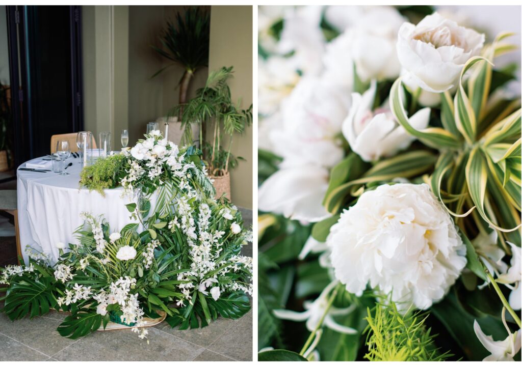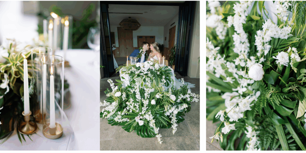 As the sun began to set, they moved to the Hanalei Suite for an intimate dinner reception. The table was elegantly styled with beautiful greenery draped over the table and flowers cascading down. This is what elopements are all about: creating exactly the experience you want, surrounded by beauty with the person you love.