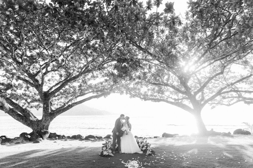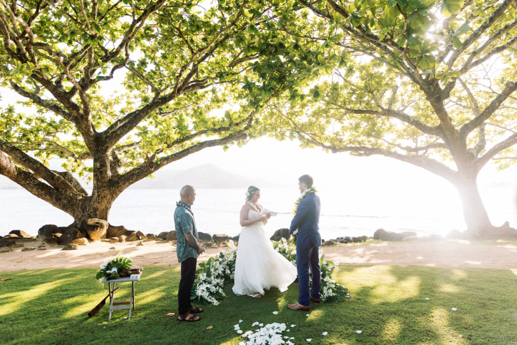 Diana Gardner from Alohana Kauai Weddings coordinated the details, and North Shore Buds & Blooms created a simple floral center piece for the couple to stand in during the ceremony. The ceremony took place on Kamani Cove, with Hanalei Bay glittering behind them. The way the afternoon light filters through the trees there, and how you can hear the sound of the waves gently crashing on the shore, it is an atmosphere that feels intimate and magical.